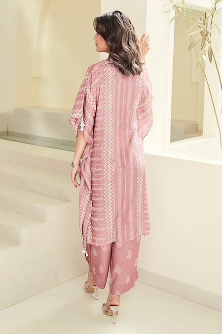Pastel pink asymmetric hemline tunic with all over aztec print. Paired with a paisley print trouser.
