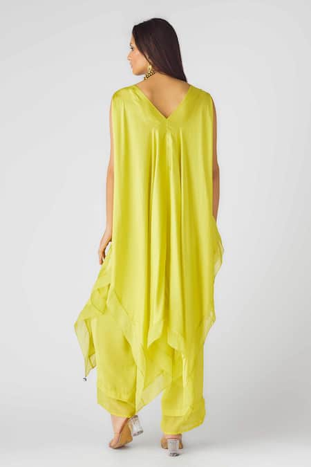 Buy_Basanti - Kapde Aur Koffee_Yellow Modal, Satin Sequins V-neck Embellished Kaftan And Pants Set_Online_at_Aza_Fashions