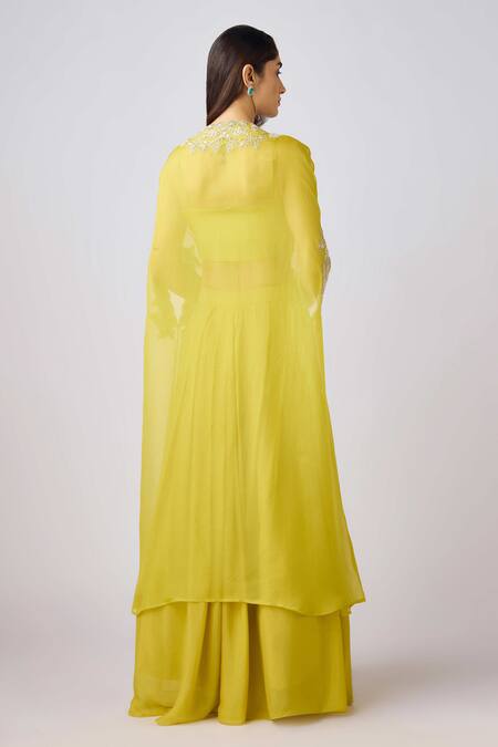 Yellow embroidered lehenga set featuring a scalloped hem blouse with adjustable straps. Paired with a draped cape showcasing cutdana and sequins floral work.
