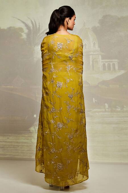 Yellow Viscose, Crepe Sequins, Zari Sweetheart Embroidered Cape Draped Skirt Set