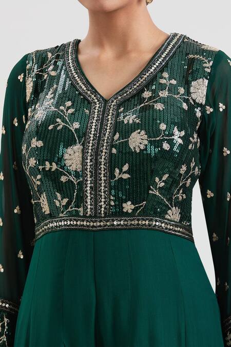 Green Georgette Sequins, Zari, Cut Work Floral Embroidered Flared Jumpsuit