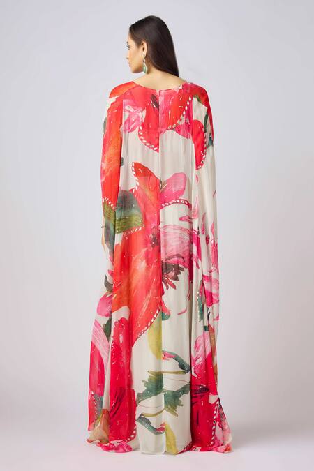 Multi Color Silk, Crepe Sequins, Beads Floral Print Cape And Flared Pant Set