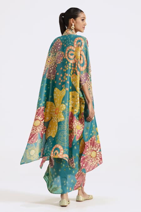 Multi color long cape featuring an all-over floral print with contrast zardozi and intricate bead & sequin hand embroidery. Paired with a printed box pleated draped skirt and an embroidered corset blouse.