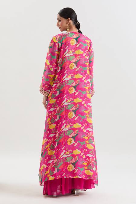 Pink longline jacket featuring abstract floral prints and gota patti work on the border. Paired with a coordinating padded blouse and solid sharara.