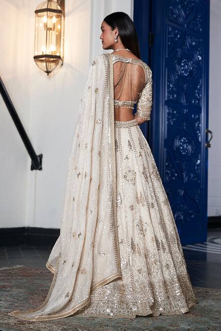 Ivory lehenga featuring intricate sequin, cutdana & dori embroidery in a floral pattern. Paired with an embroidered padded blouse and a matching dupatta adorned with tassels.