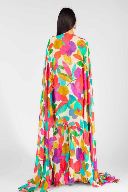 Multicolor asymmetric kaftan featuring floral vine patterns with bead, mirror work & sequin embellishments. Paired with a coordinating inner bustier and sharara.