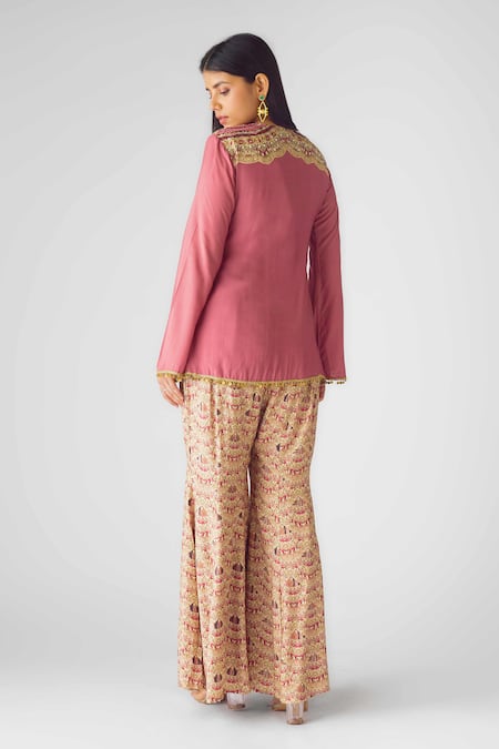 Pink short kurta featuring a keyhole neckline and full sleeves, adorned with floral patterns and embellished with mirror, sequin, stone work, and sequin lace borders. Paired with a scallop patterned sharara for a complete look.