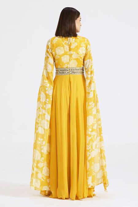 Hand-embroidered neckline with intricate cutdana and zari work, Cascading cape sleeves for added elegance, Attached embroidered belt enhancing silhouette