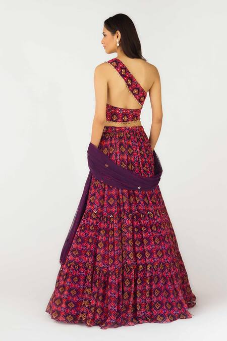 Purple tiered lehenga featuring geometric patola patterns and embellished with sequins on the waistband. Paired with a padded one shoulder blouse adorned with mirrorwork, beads, and ghunghroo, along with a matching dupatta.