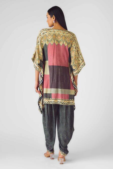 Multicolor kaftan kurta featuring geometric print with intricate sequin, mirror, and bead embroidery. Paired with a stylish printed dhoti pant for a complete look.