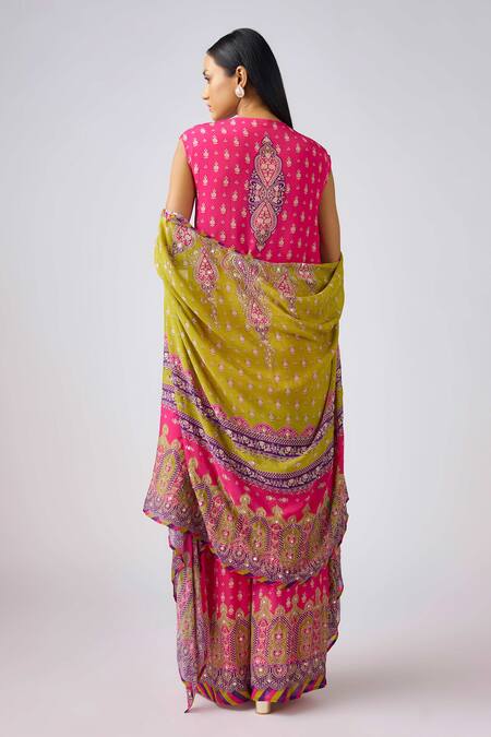 Lime green cape featuring slit sleeves with all-over gulshan print and mirror, sequin highlights. Paired with a rani pink kurta adorned with mirror and sequin hand embroidery along with a matching flared pant.