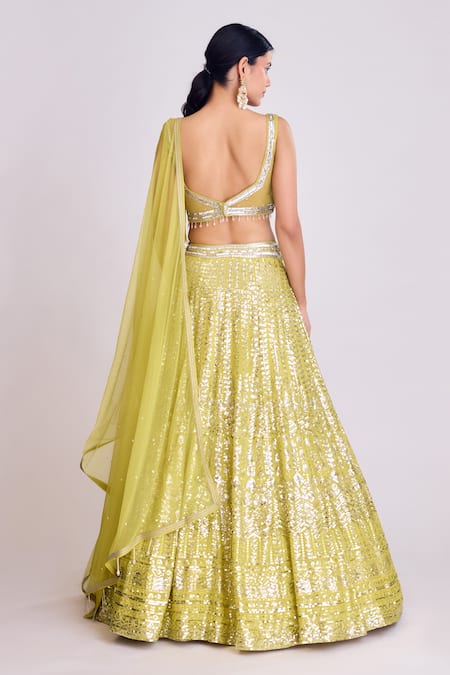 Green lehenga featuring sequin embroidery in a leaf pattern. Paired with a sleeveless embroidered padded blouse and a matching dupatta.