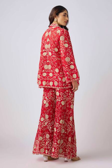 Red chantilly net jacket featuring flared sleeves and ornate blossom embroidery. Paired with a matching padded ruched bustier and embroidered flared pant.