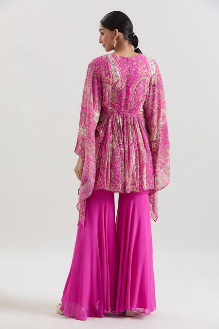 Pink tunic featuring paisley prints, gathered design, and sequin embroidered placket. Paired with a solid sharara for a complete look.