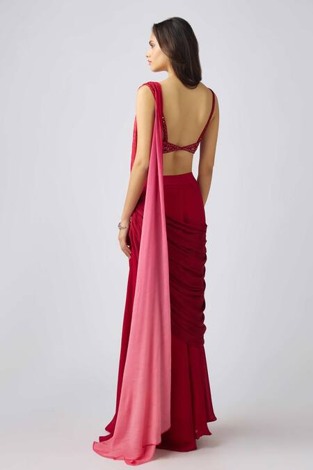 Red pre-draped sharara style saree featuring a gradient shaded pallu embellished with sequins. Accompanied by a padded blouse adorned with thread, sequin, and mirror embroidery.
