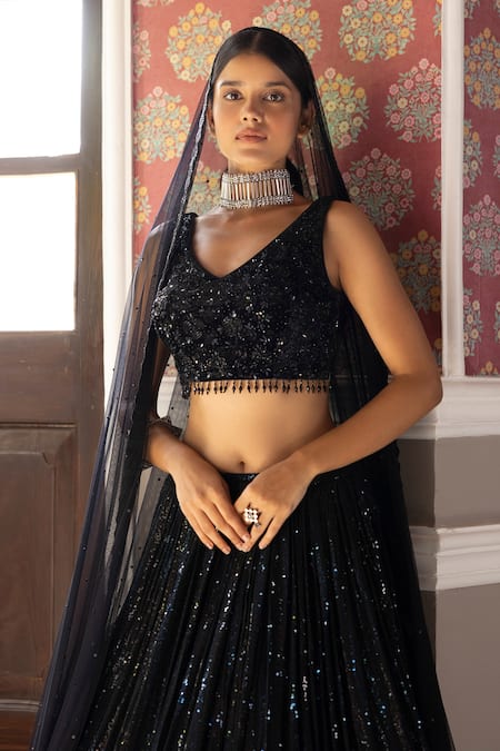 Black lehenga in georgette base with sequins embroidery. Comes with a velvet hand embroidered blouse and a soft net dupatta.