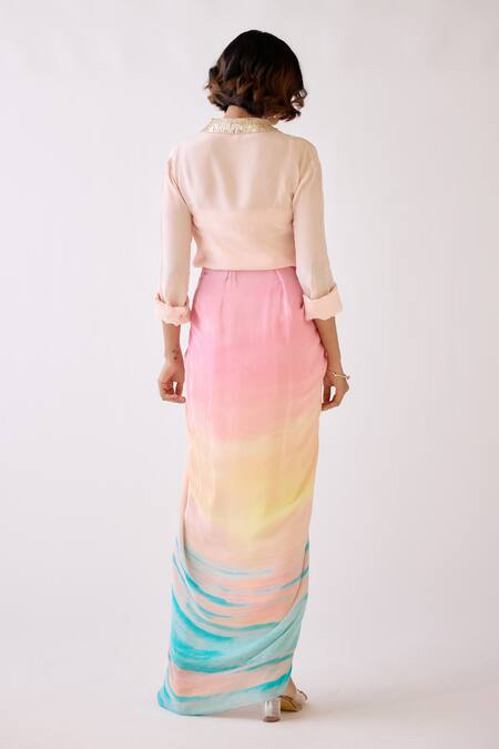 Pink Crepe Sequins Collared Shirt With Ombre Draped Skirt