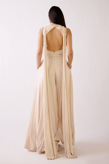 Gold Lycra Sequins, Pearls Round Neck Embroidered Jumpsuit