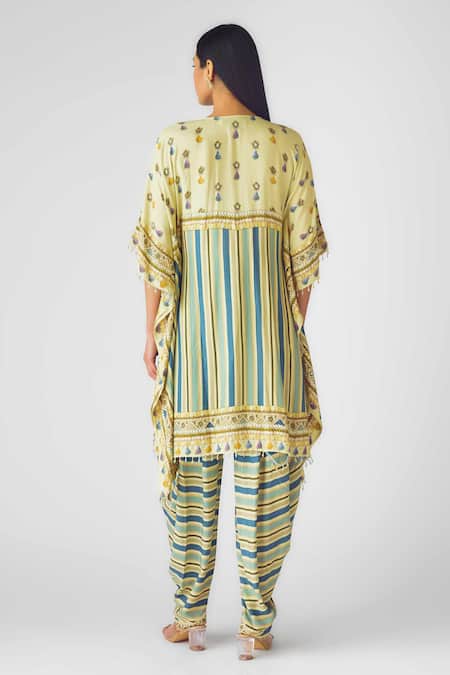 Yellow embellished kurta featuring floral and stripe patterns with tassel borders. Paired with coordinating stripe-patterned dhoti pant.