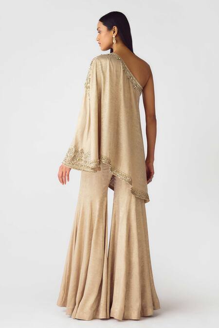 Buy_Basanti - Kapde Aur Koffee_Gold Georgette Pearls, Sequins, Cut Work Asymmetric Embroidered Cape Sharara Set_at_Aza_Fashions