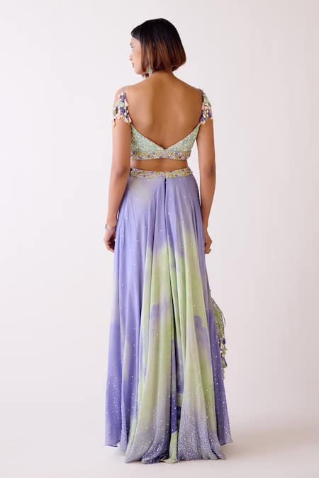 Lilac ombre lehenga featuring all-over sequin embroidery. Paired with a padded blouse adorned with sequins, stones, beads, and crystal embroidery, enhanced by colorful tassel sleeve straps.
