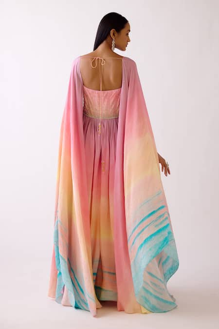Pink sunset ombre effect Anarkali featuring a padded bodice and attached cape style dupatta
