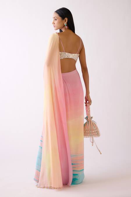 Pink sunset ombre effect pre-draped saree featuring leaf sequin embroidery. Paired with a padded blouse with a sweetheart neckline and side zip closure.
