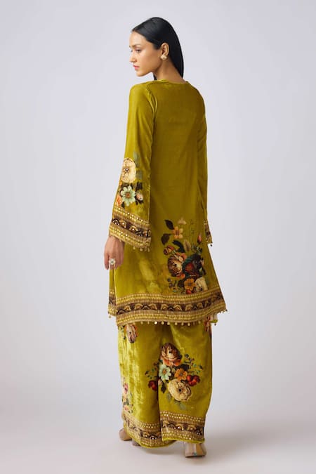 Buy_Basanti Kapde aur Koffee_Green Velvet Mirrors, Sequins, Smocking, Beads V-neck Embellished Kurta Set_Online_at_Aza_Fashions