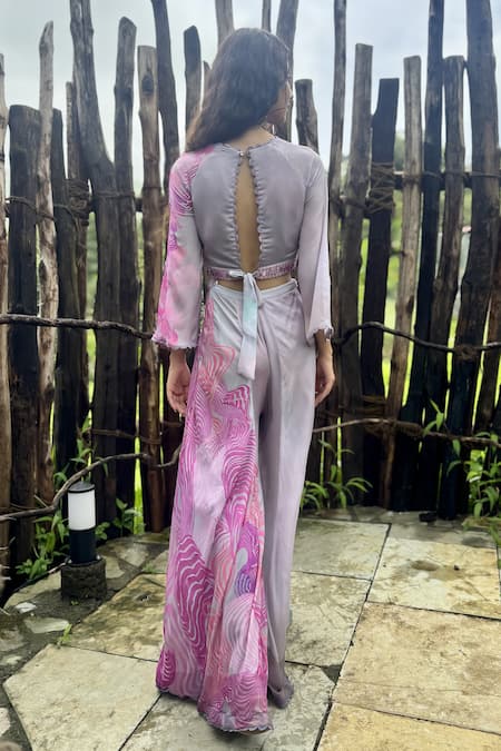 Lilac chinnon chiffon blouse featuring a V-neckline, scalloped edges, and bell sleeves with pink abstract patterns. Paired with coordinating lilac chinnon chiffon wide-leg pants adorned with pink abstract patterns and a matching waist band.