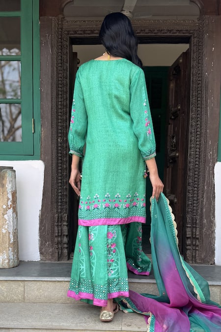 Aqua green kurta featuring intricate embroidery and a relaxed fit. Paired with a matching sharara and a chiffon dupatta.