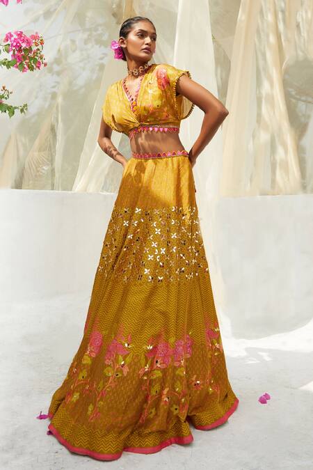 Back tie-up detailing on blouse, Floral printed dupatta, Mirror embellishments on lehenga