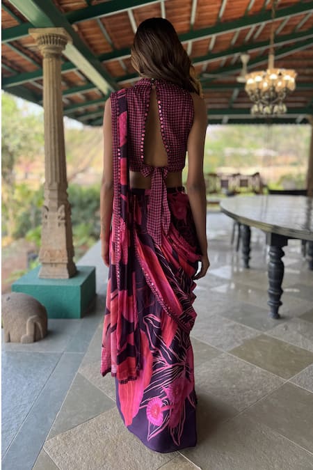 Wine chiffon blouse featuring a backless design and embellished details. Paired with a matching chiffon saree adorned with floral prints.