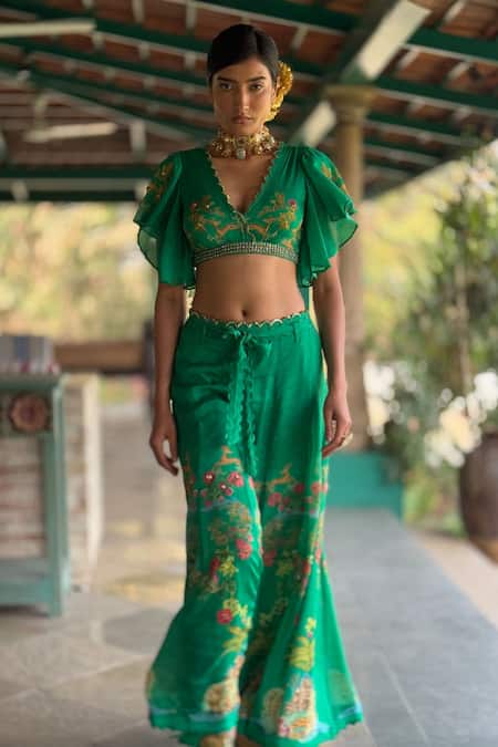 Green crop top featuring embroidery and a scalloped neckline. Paired with matching flared palazzo pants.