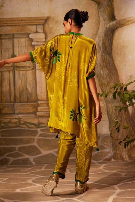 Green asymmetric kurta featuring mirror tassels, sequins embroidery, and floral bird print. Paired with coordinating crepe pant.