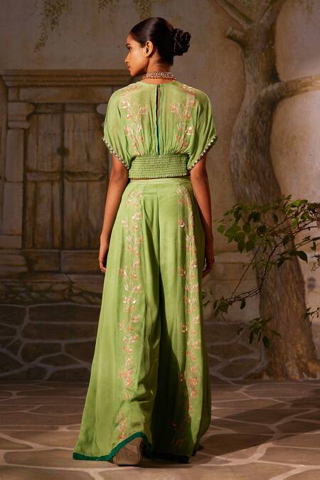 Green Chiffon Embroidery, Mirrors, Tassels Floral Twisted Top And Flared Pant Set