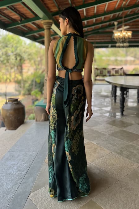 Green floral print top in chiffon featuring a deep V neckline and back tie-up. Paired with a matching pant in gajji satin with intricate floral embroidery.