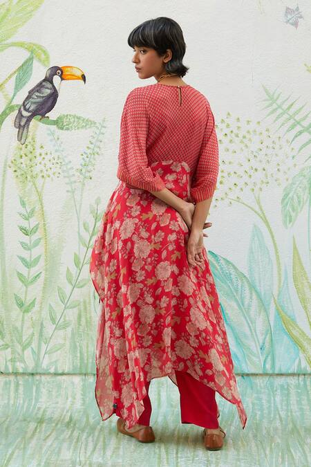 Razzberry asymmetrical kurta featuring floral prints and embroidery detailing. Paired with matching pants for a complete look.