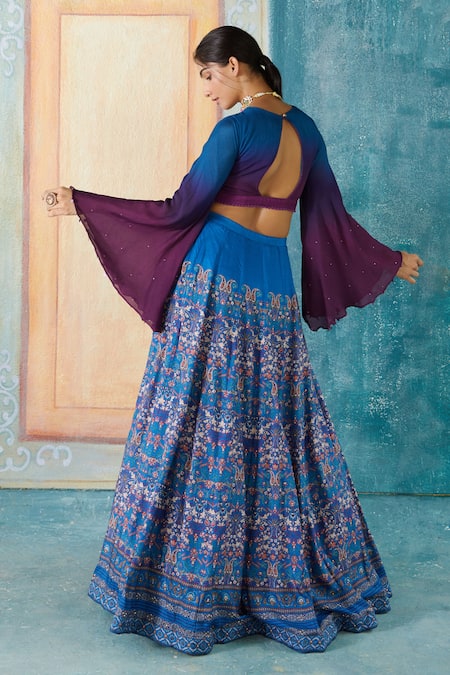 Blue lehenga featuring a geometric paisley print with embellishments. Paired with an ombre embellished crop top and a dupatta.