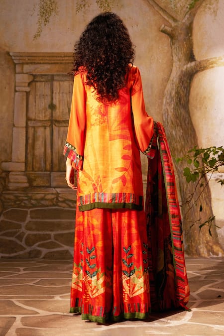 Red straight kurta featuring notched neckline with leaf, stripe print and mirror lace embroidery. Paired with a coordinating sequin embroidered flared sharara and tasselled dupatta.