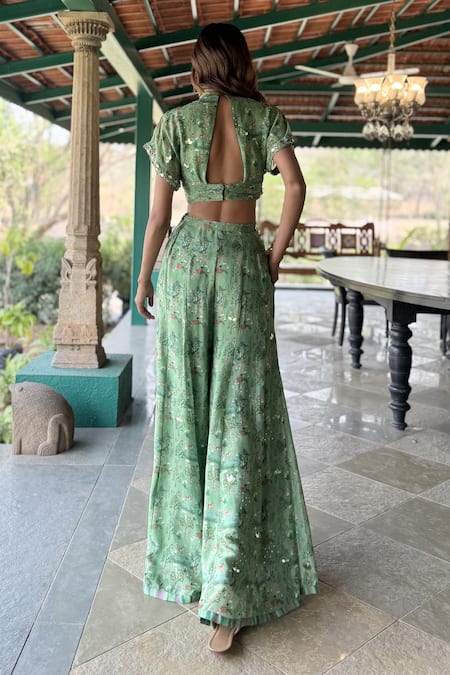 Mint green chiffon top featuring a cropped design and intricate embellishments. Paired with matching chiffon wide-leg pants adorned with a floral pattern.