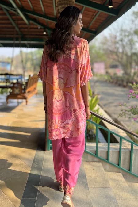 Pink printed kurta featuring a relaxed fit and half sleeves. Paired with matching pink pants for a complete look.
