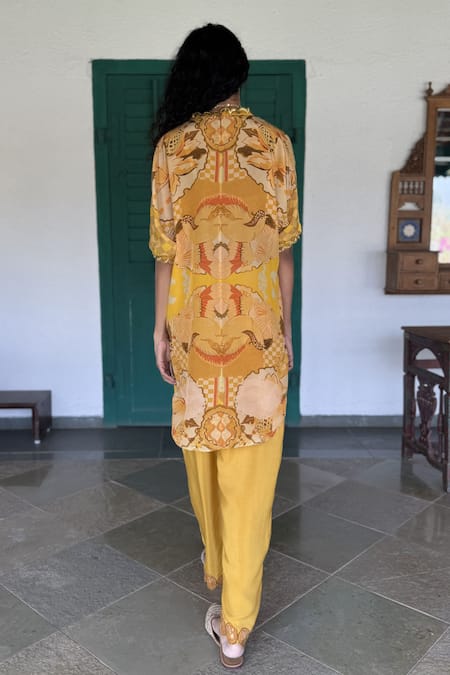 Yellow printed kurta featuring a round neckline and short sleeves. Paired with matching yellow pants that have decorative hem detailing.