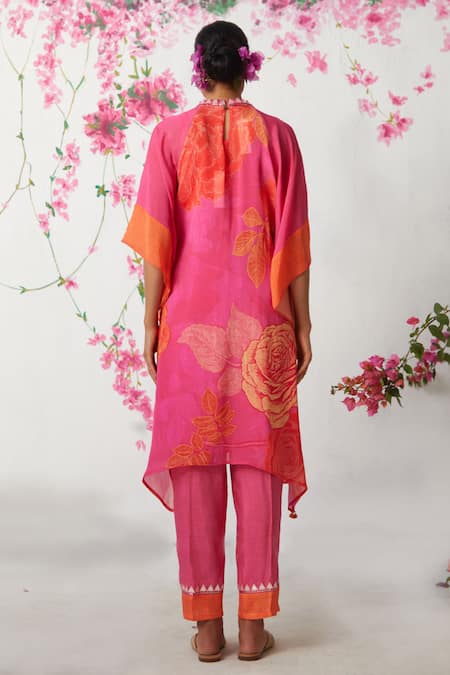 Pink kaftan featuring all over rose bloom prints and an embellished neckline. Paired with coordinating pants that complement the kaftan's vibrant design.
