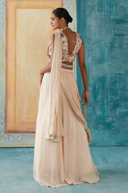 Beige pre-draped saree featuring cutdana and tassels embroidered palla. Paired with a floral print and beads embroidered blouse with a belt.