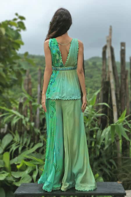 Aqua green chinnon chiffon top featuring a stripe pattern, V-neck, button-down front, and scalloped edges. Paired with coordinating wide-leg chinnon chiffon pants with a stripe pattern.