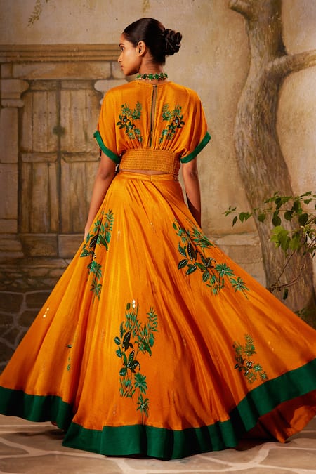 Yellow Chiffon Mirrors, Embroidery V-neck Tropical Twisted Bodice Lehenga Set