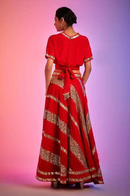 Red back tie-up crop top with sequin work panels & V neckline.