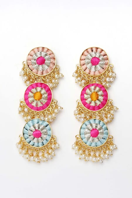 Multi color dangler earrings featuring three-tier circular design with zari embroidery and pearl embellishments