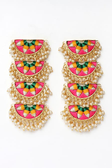 22kt gold plated four tier semicircular earrings featuring vibrant pink, green, yellow zari embroidery and adorned with pearls