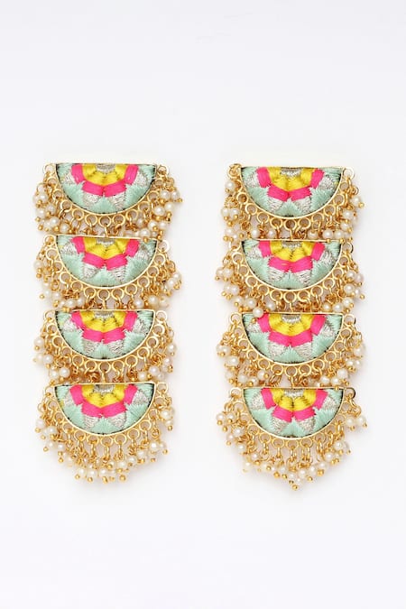 22kt gold plated four tier semicircular earrings featuring blue, pink and yellow embroidery work with pearl embellishments